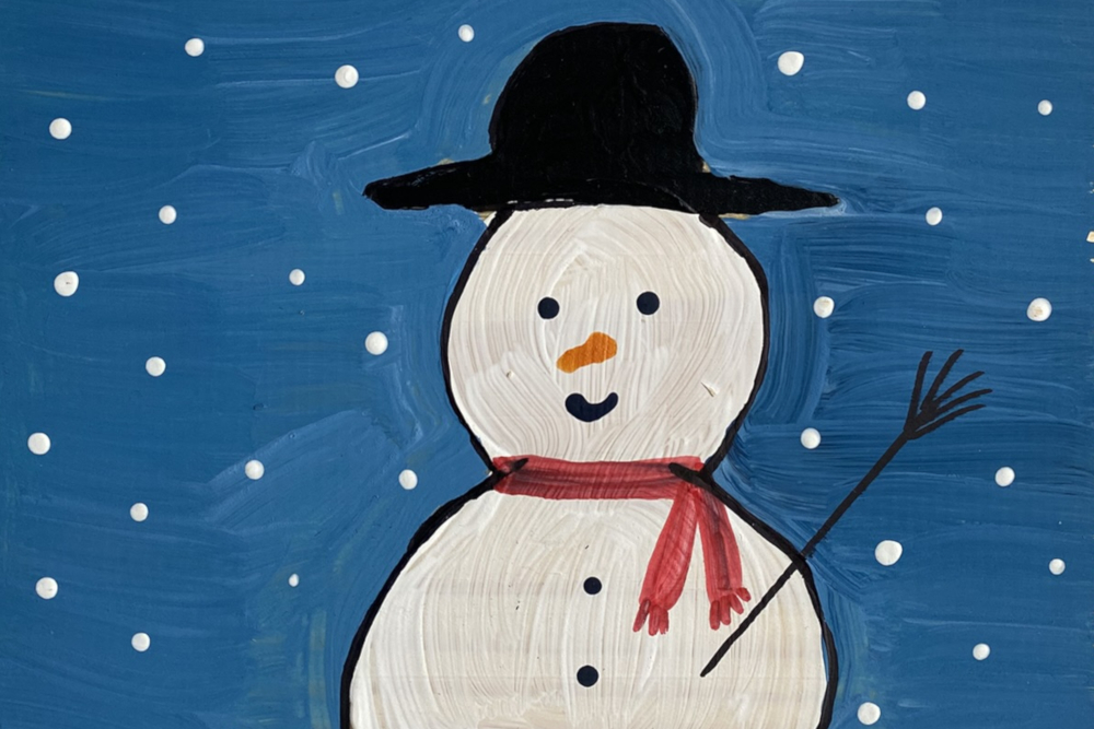 Die Kinder der Klasse 1c gestalteten im Kunstunterricht ein Schneemannbild auf Holz.Zunächst mussten alle mit dem Handbohrer mühsam zwei Löcher für die Aufhängung bohren. Danach malten die Kinder mit Acrylfarbe lustige Schneemänner auf die...