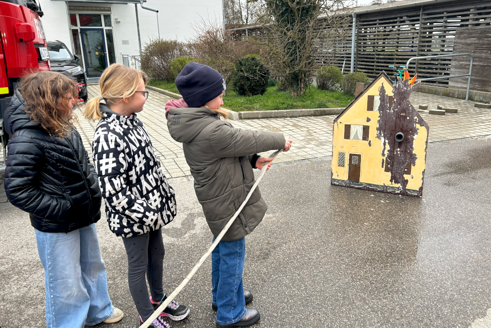 Ein besonderes Highlight war, dass wir (fast) wie echte Feuerwehrleute die Wasserschläuche ausrollen und ein „brennendes Haus“ löschen durften. Am Ende wurde uns noch gezeigt, wie man sich mit dem Atemschutz richtig ausrüstet.