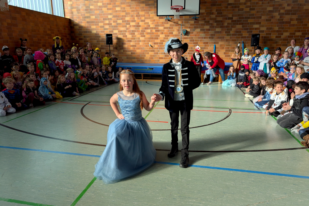 Dann startete die große Polonäse durch das Schulhaus. Alle Klassen wurden eingesammelt und gemeinsam ging es in die Turnhalle. Dort wartete schon das Kinderprinzenpaar und die Kindergarde der Inntalia Mühldorf, die mit einem lauten „Innau!“ begrüßt wurden. Das Prinzenpaar zeigte seinen Faschingswalzer und die Kindergarde fetzige Tänze.