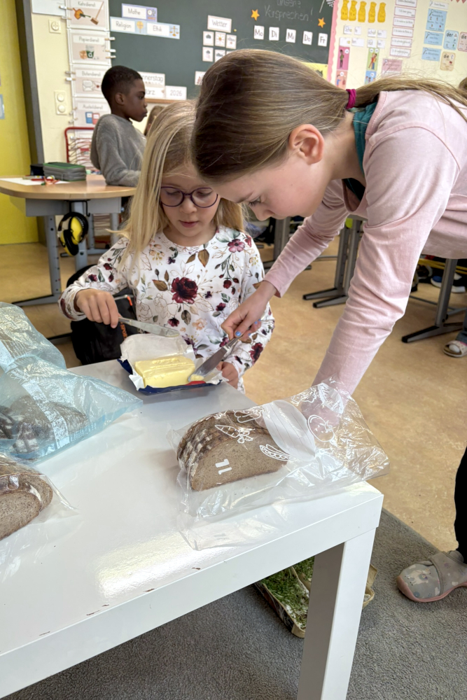 Nach etwa einer Woche war es dann so weit: Die Kresse war groß genug und konnte geerntet werden. Das Highlight für alle war natürlich das gemeinsame Probieren. Frisch geerntet landete die Kresse direkt auf einem Butterbrot – und schmeckte besonders gut!