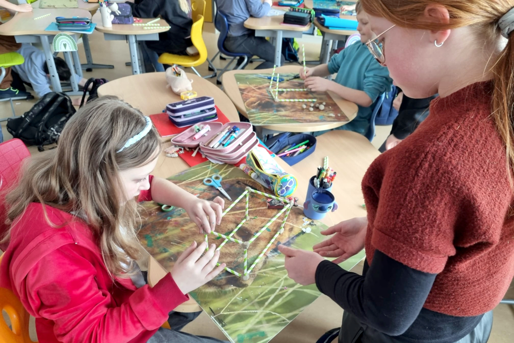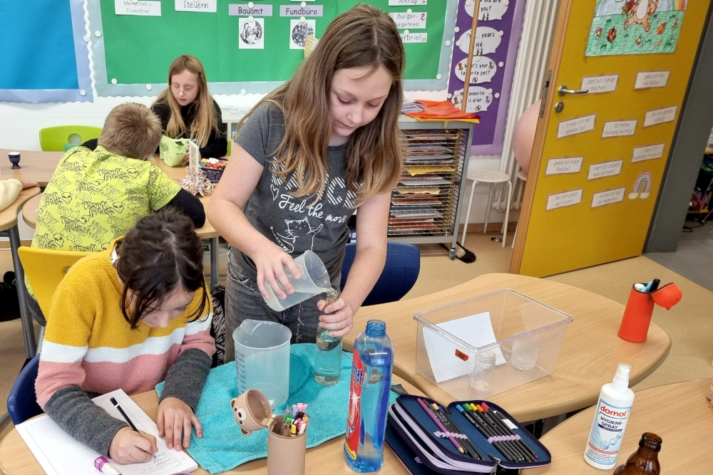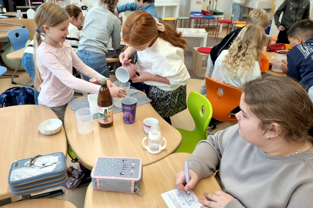 Zu zwei Themen im Fach Mathematik wendete die Klasse 4c praktische Arbeitsweisen an, um diese leichter erfahrbar zu machen. Zunächst führten die Kinder Versuche zu den „Hohlmaßen“ durch. Hierbei schätzten die Kinder zuerst das Fassungsvermögen von Behältnissen wie einer Milchtüte oder einer Babyflasche und maßen im Anschluss mit dem Messbecher nach. Ebenso bestimmten sie mit Hilfe vorgegebener Gefäße (z.B. Joghurtbecher, Dose, Mundspülung), wie oft diese gefüllt werden müssen, um einen Liter zu erhalten. Zum Thema „Kantenmodelle des Quaders“ stellten die Kinder aus Strohhalmen und Knetmasse verschiedengroße Kantenmodelle von Quadern her. Diese wurden anschließend zur Erarbeitung von Quadernetzen sowie dem Kantenwandern verwendet.