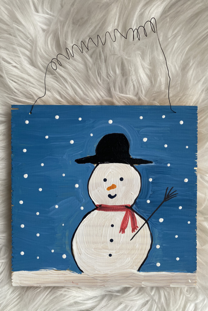 Die Kinder der Klasse 1c gestalteten im Kunstunterricht ein Schneemannbild auf Holz.