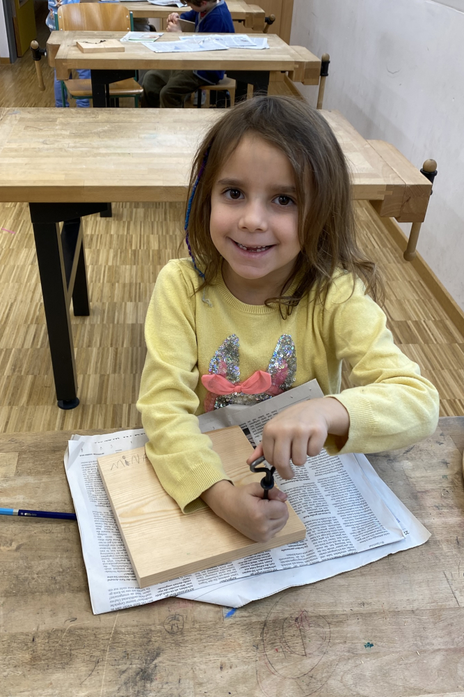 Zunächst mussten alle mit dem Handbohrer mühsam zwei Löcher für die Aufhängung bohren. Danach malten die Kinder mit Acrylfarbe lustige Schneemänner auf die Holzplatte. Abschließend befestigten sie einen Draht am Brett, damit das winterliche Kunstwerk zu Hause aufgehängt werden kann.